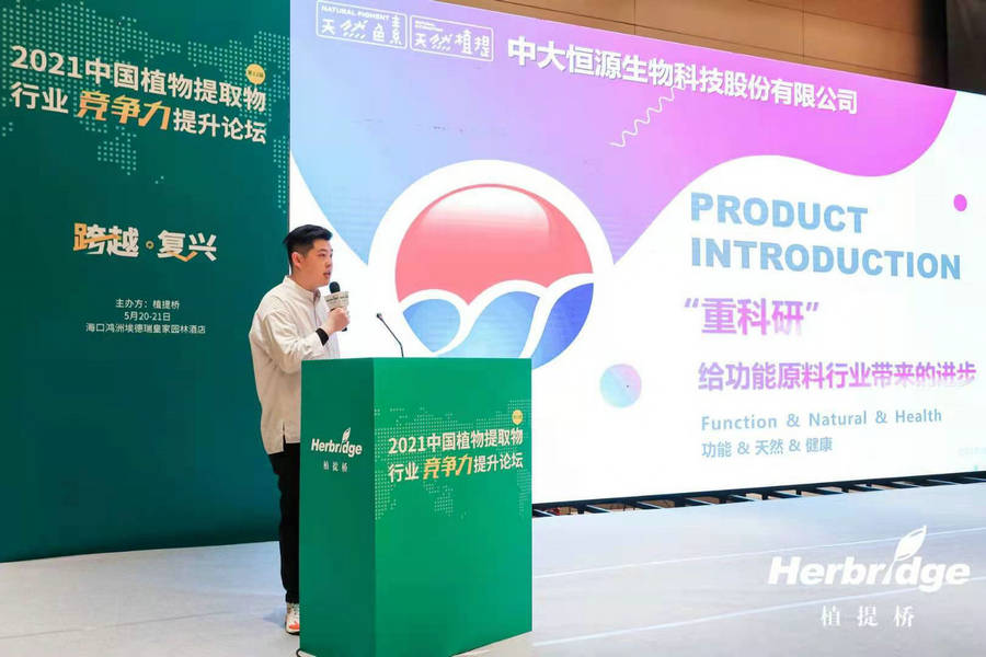 2021年5月20-21日第12届中国植物提取物行业竞争力提升论坛在海口市举行,必一体育官网销售总经理金子恒应邀参会,并在论坛作了《“重科技”给功能原料行业带来的进步》主题演讲,引发与会人员的广泛关注。